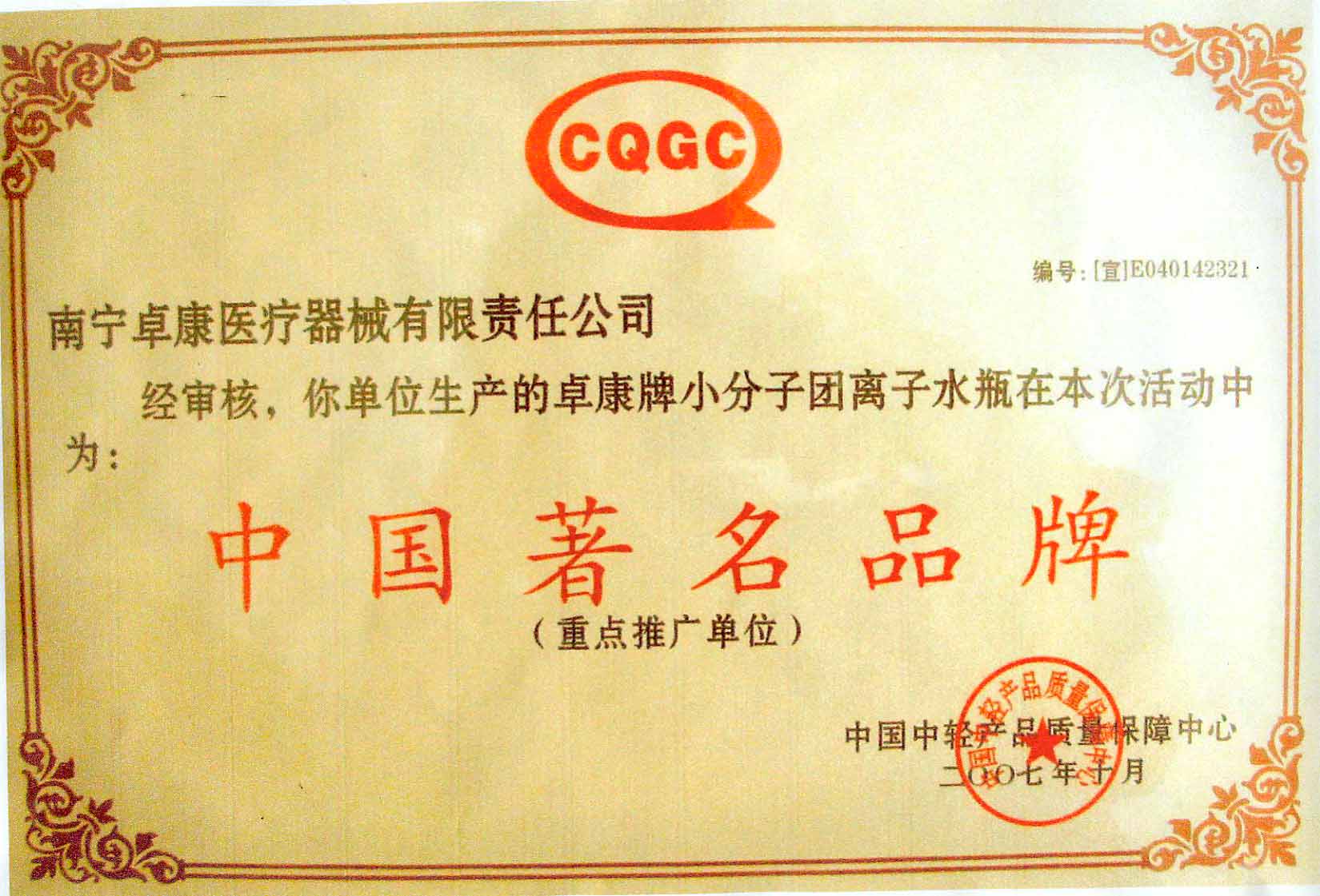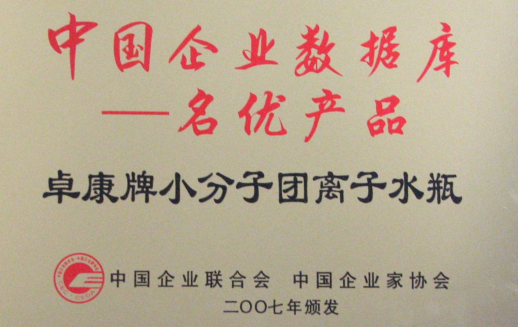 卓康牌離子水瓶榮獲中國企業(yè)名優(yōu)產(chǎn)品[點(diǎn)小圖見大圖]、中國著名品牌稱號(hào)[點(diǎn)小圖可見大圖]