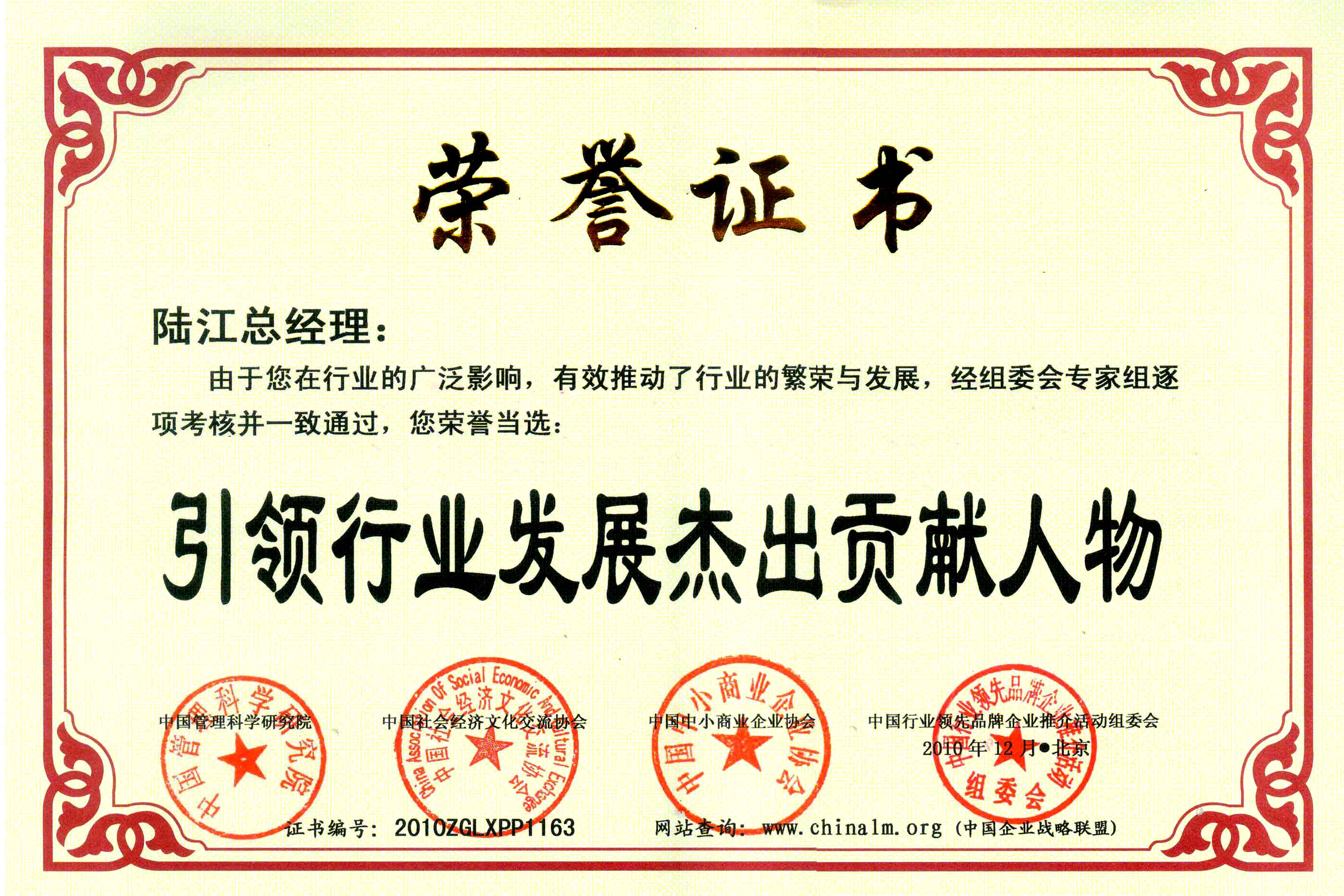 陸江榮獲引領(lǐng)行業(yè)發(fā)展杰出貢獻(xiàn)人物證書 --------卓康公司榮獲全國質(zhì)量、服務(wù)、信譽(yù)AAA級(jí)品牌證書
