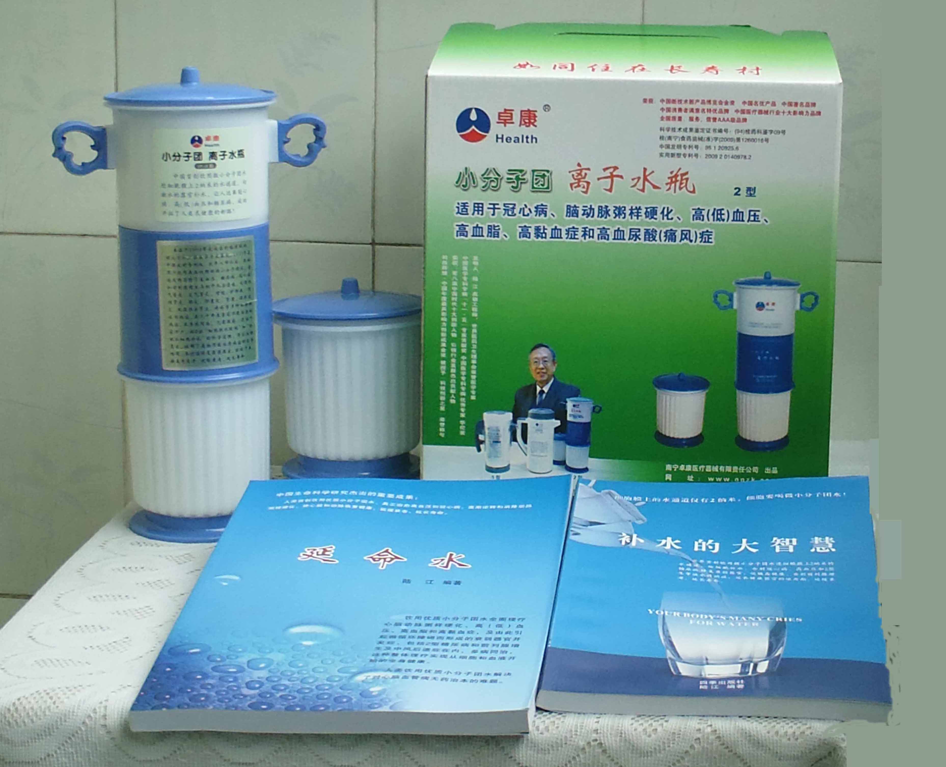 本品大量用戶的使用效果表明,能治愈冠心病、腦動(dòng)脈硬化、原發(fā)性高(低)血壓、高血脂、高粘血癥、高血尿酸癥(痛風(fēng))和2型糖尿病、衰弱器官并發(fā)癥(前列腺增生、腎衰與尿毒癥)及中風(fēng)后遺癥等療效好。產(chǎn)品配信譽(yù)卡。使用壽命30年,不換芯,易清洗。團(tuán)購優(yōu)惠。從郵局匯款,匯費(fèi)1%,地址按本頁下方地址、聯(lián)系人寫。從銀行匯款,請(qǐng)點(diǎn)擊[聯(lián)系匯款]欄,從工商銀行匯款,建設(shè)銀行、農(nóng)業(yè)銀行匯款,均免收匯費(fèi),匯款后20--30分鐘內(nèi)發(fā)短信,可用微信轉(zhuǎn)帳,均免匯費(fèi),微信號(hào)即手機(jī)號(hào)13768308380。匯款后,告知你的姓名和地址,我公司聯(lián)系人手機(jī)號(hào)是:13768308380。卓康牌離子水瓶為我公司獨(dú)家生產(chǎn),郵購產(chǎn)品配《補(bǔ)水的大智慧》彩印書一本,另配四季出版社出版的新書《補(bǔ)水的大智慧》一本,并配光盤一張(含央視主持人釆訪陸江的對(duì)話視頻)。目前市場和"淘寶網(wǎng)"上有人兜售假冒的偽品,望讀者審察辯別真?zhèn)危旒僬哓飧`假冒本公司的各種認(rèn)證、獲獎(jiǎng)獎(jiǎng)項(xiàng)、專利號(hào)和外包裝盒上的中英文字,包括科技成果的鑒定意見等,請(qǐng)讀者注意防偽。如何識(shí)別假貨?已經(jīng)買了假貨怎么辦?(請(qǐng)點(diǎn)擊[打假掠影][打假掠影])。